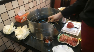 為什麼愛這家的石頭火鍋,因為他們會用麻油、沙茶、洋蔥、辣椒,先把肉爆香,並且加上高麗菜、白菜,炒到半熟,倒入高湯做成鍋底。